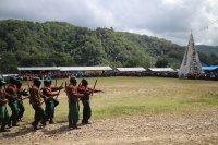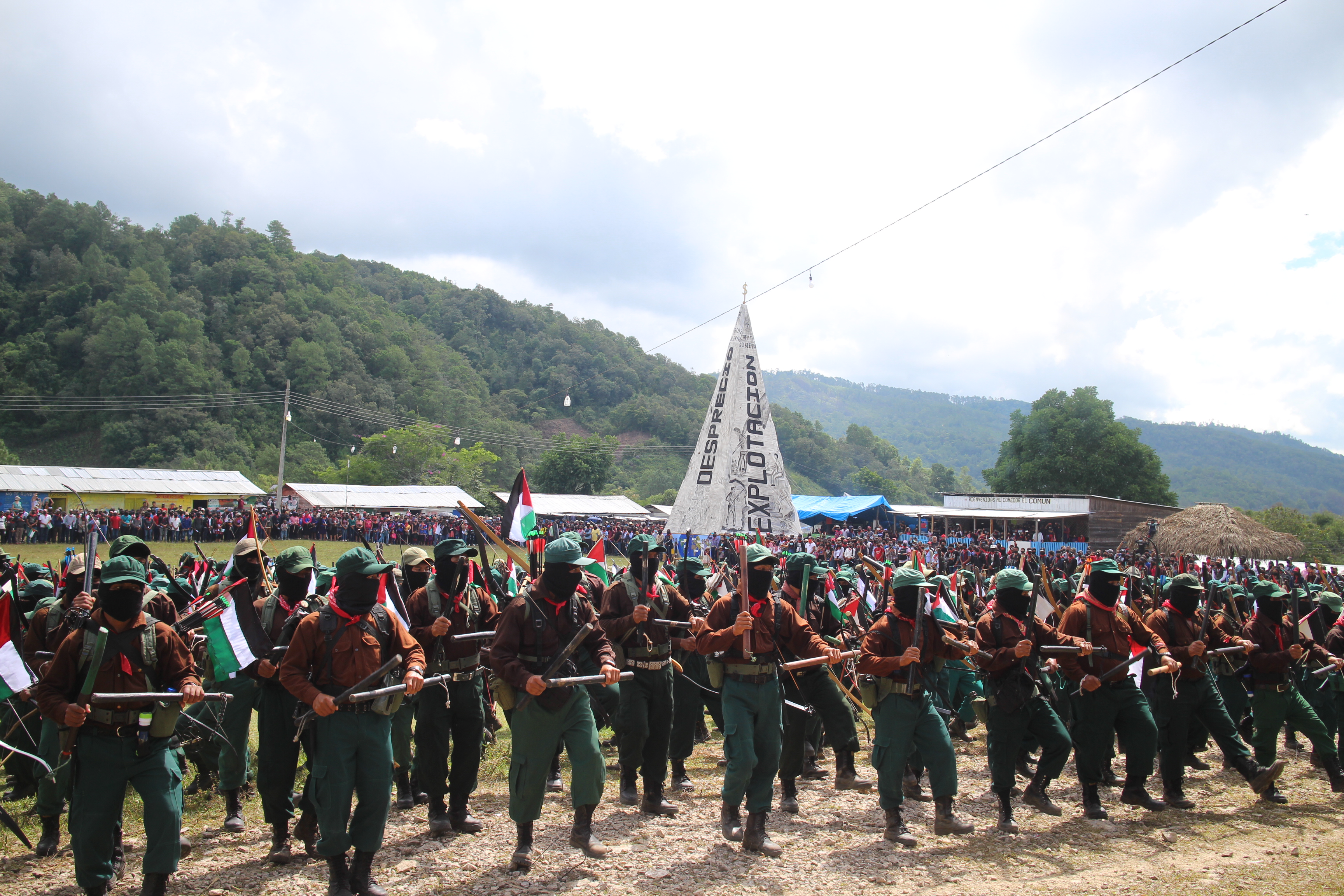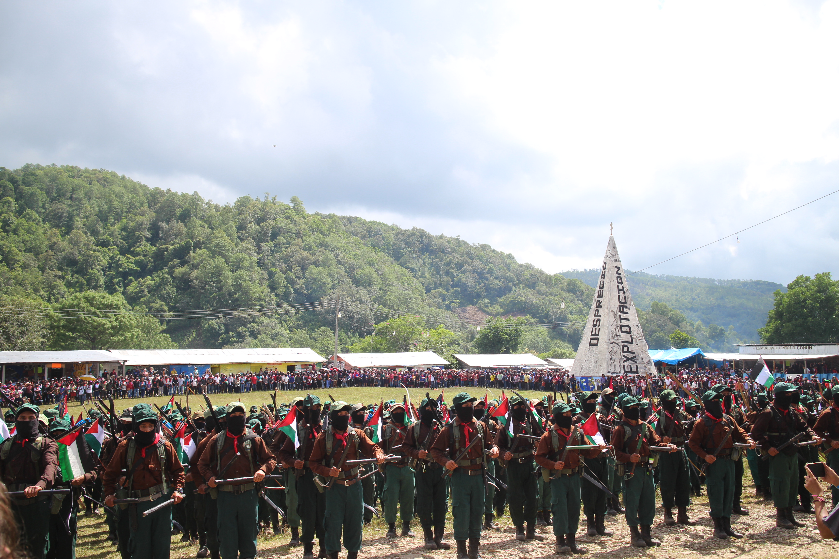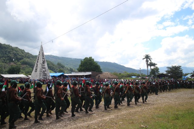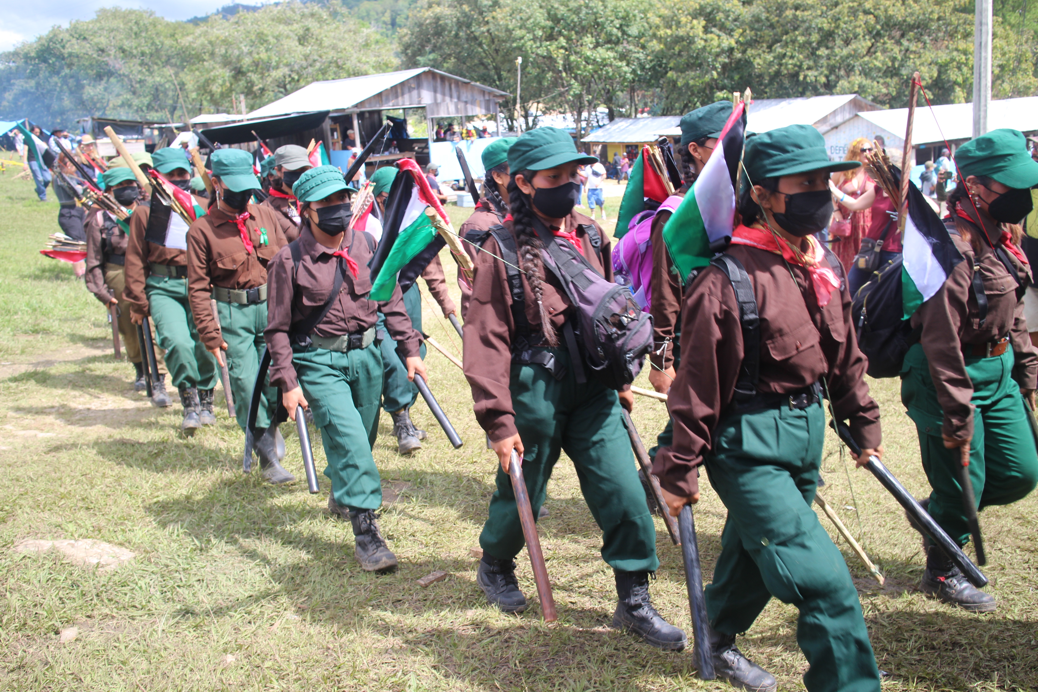 La apertura del encuentro “Algunas partes del todo” comenzó en la explanada del Semillero Comandanta Ramona con el desfile militar de cientos de milicianos y milicianas quienes portaban palos, arcos y una pequeña bandera de Palestina en su espalda. El sonido de los palos al chocar fue ocupando el espacio, al mismo tiempo que columnas de milicianos hicieron filas frente al templete.